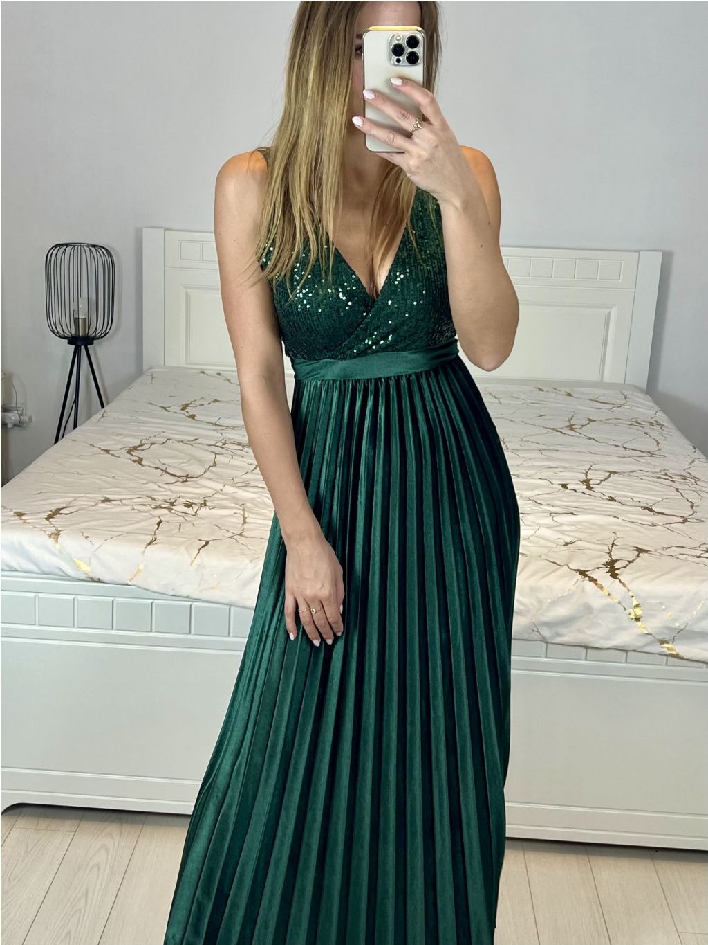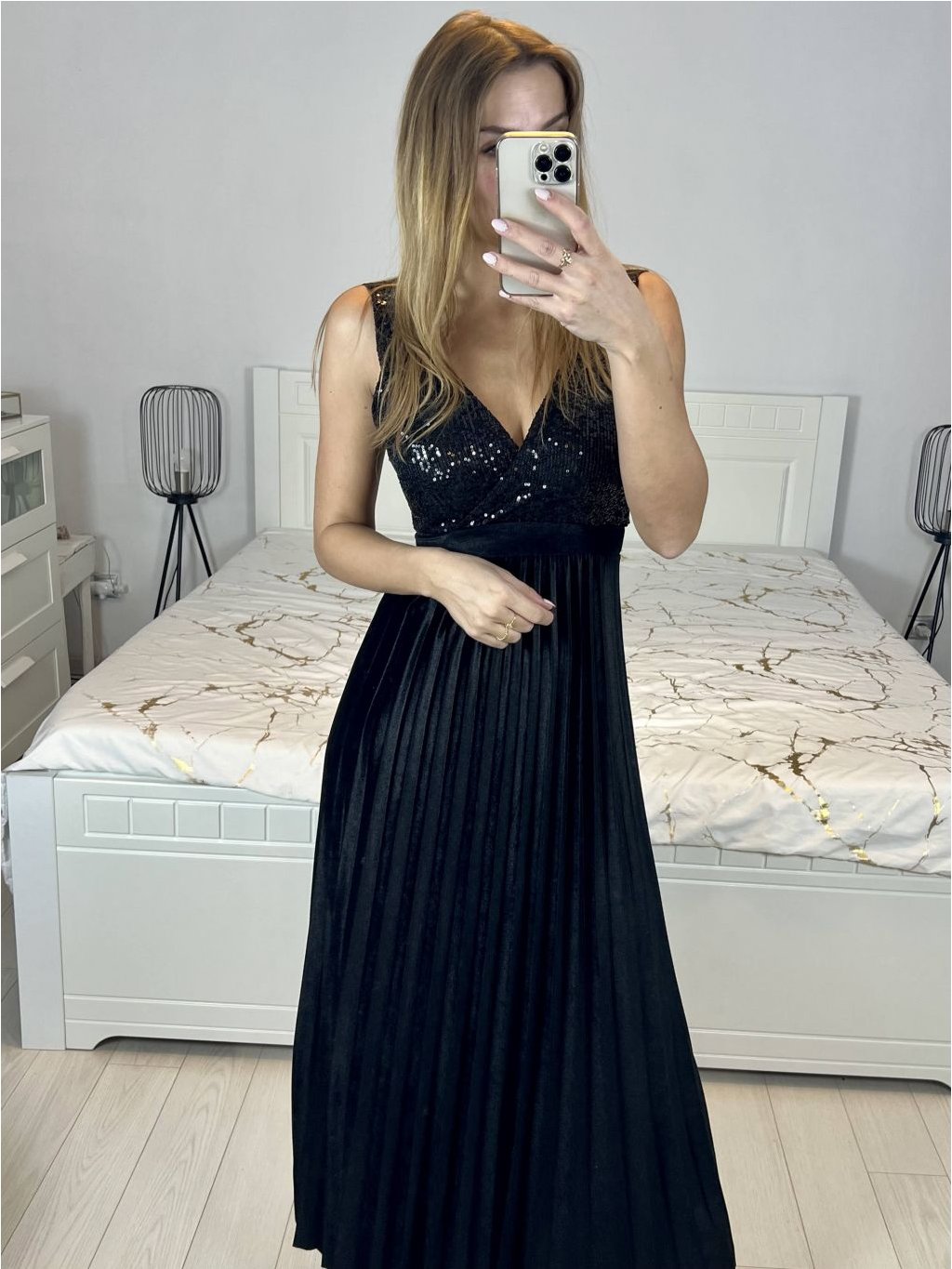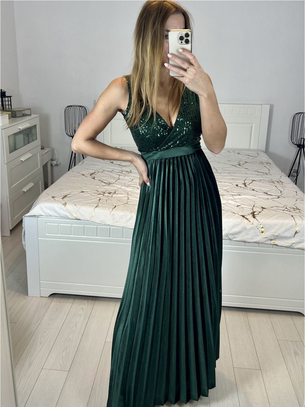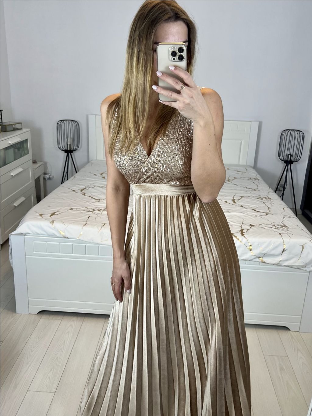 Dlouhé společenské šaty s flitrovým vrškem a sametovou skládanou sukní. Šaty mají prsní vycpávky.