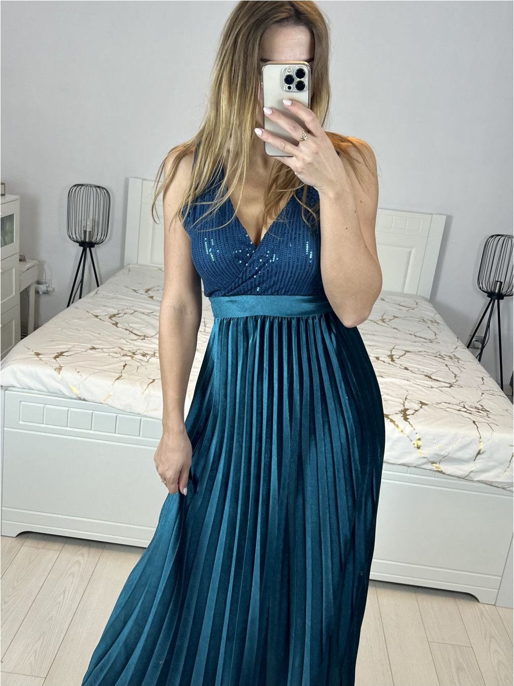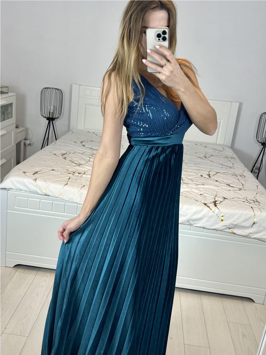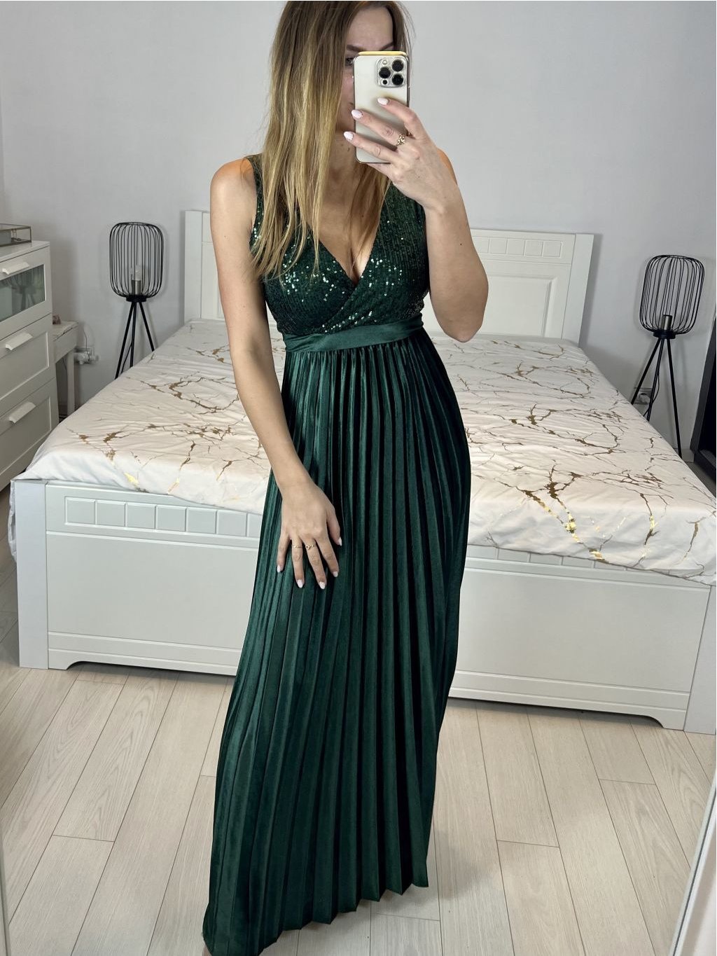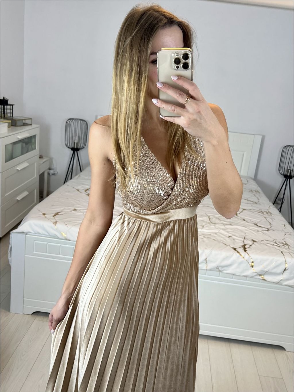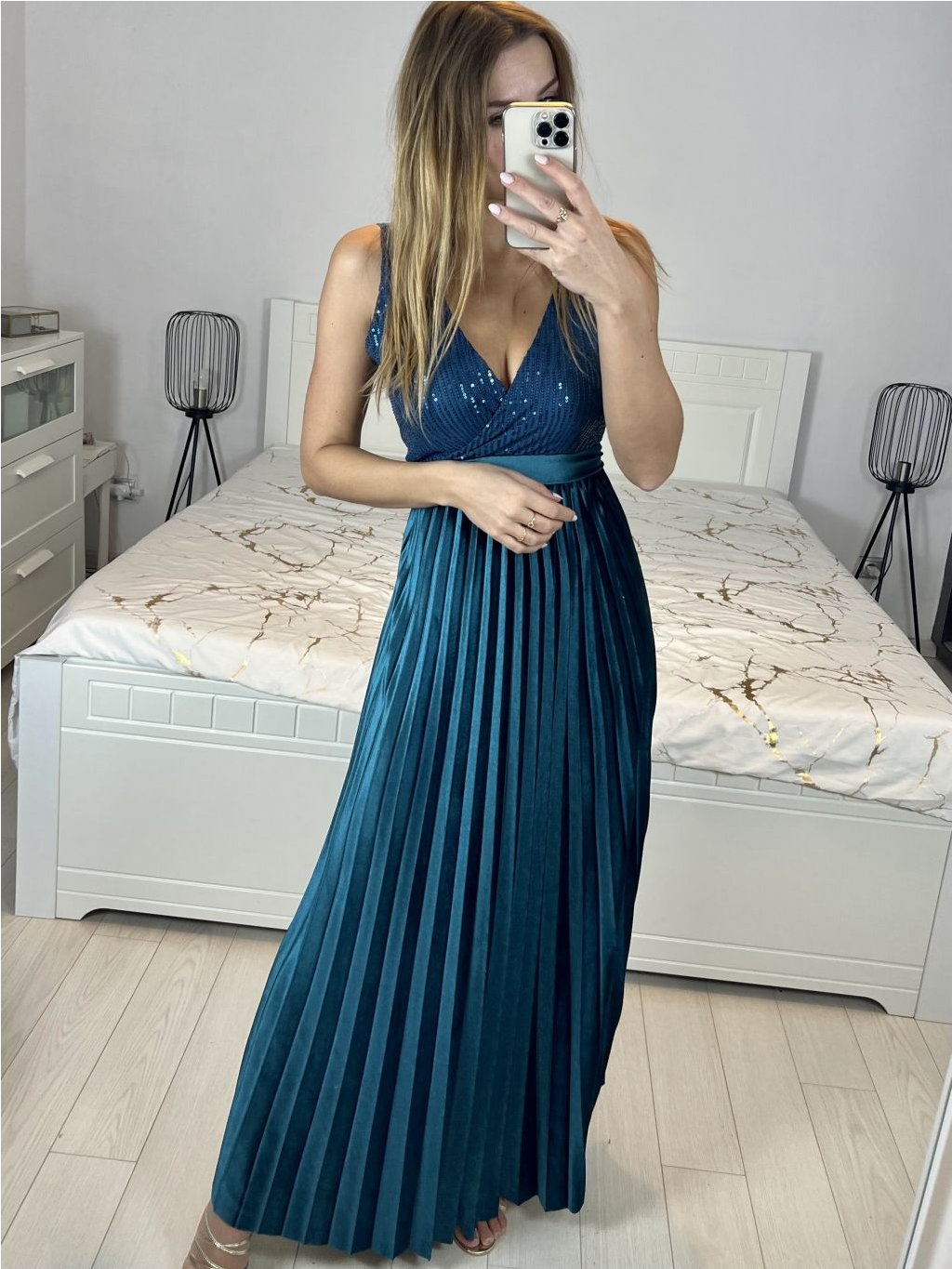Dlouhé společenské šaty s flitrovým vrškem a sametovou skládanou sukní. Šaty mají prsní vycpávky.