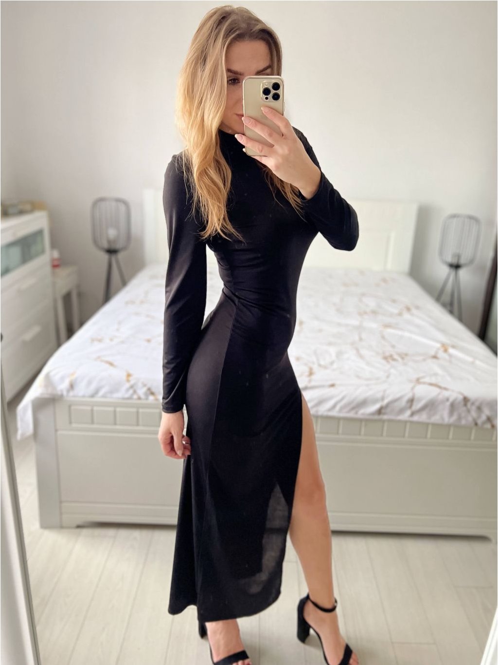 Dlouhé třpytivé šaty s dlouhým rukávem a vysokým rozparkem. Šaty mají ramenní vycpávky.