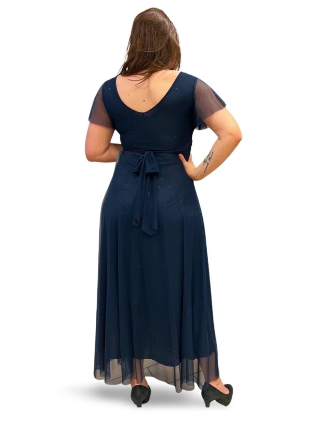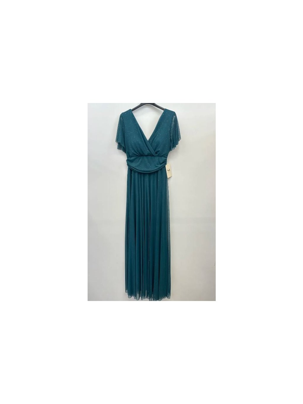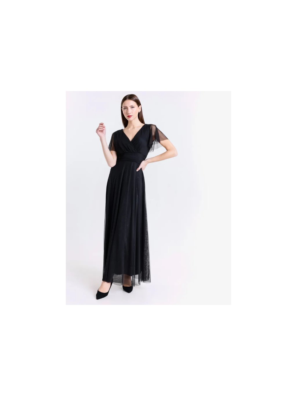 Dlouhé společenské šaty s tylovými rukávky. Šaty mají prsní vycpávky a vzadu zavazování na mašli.