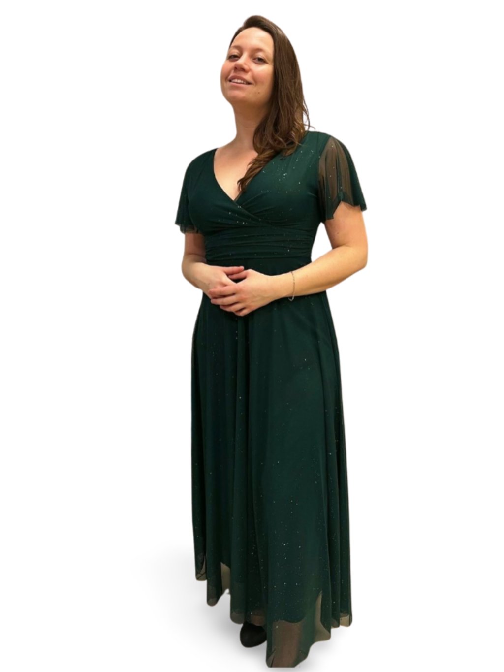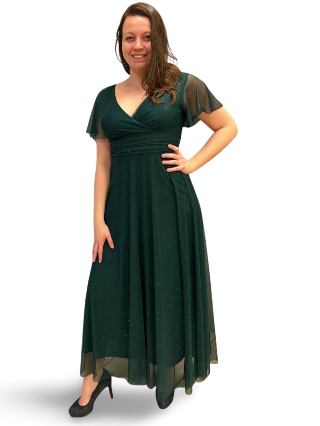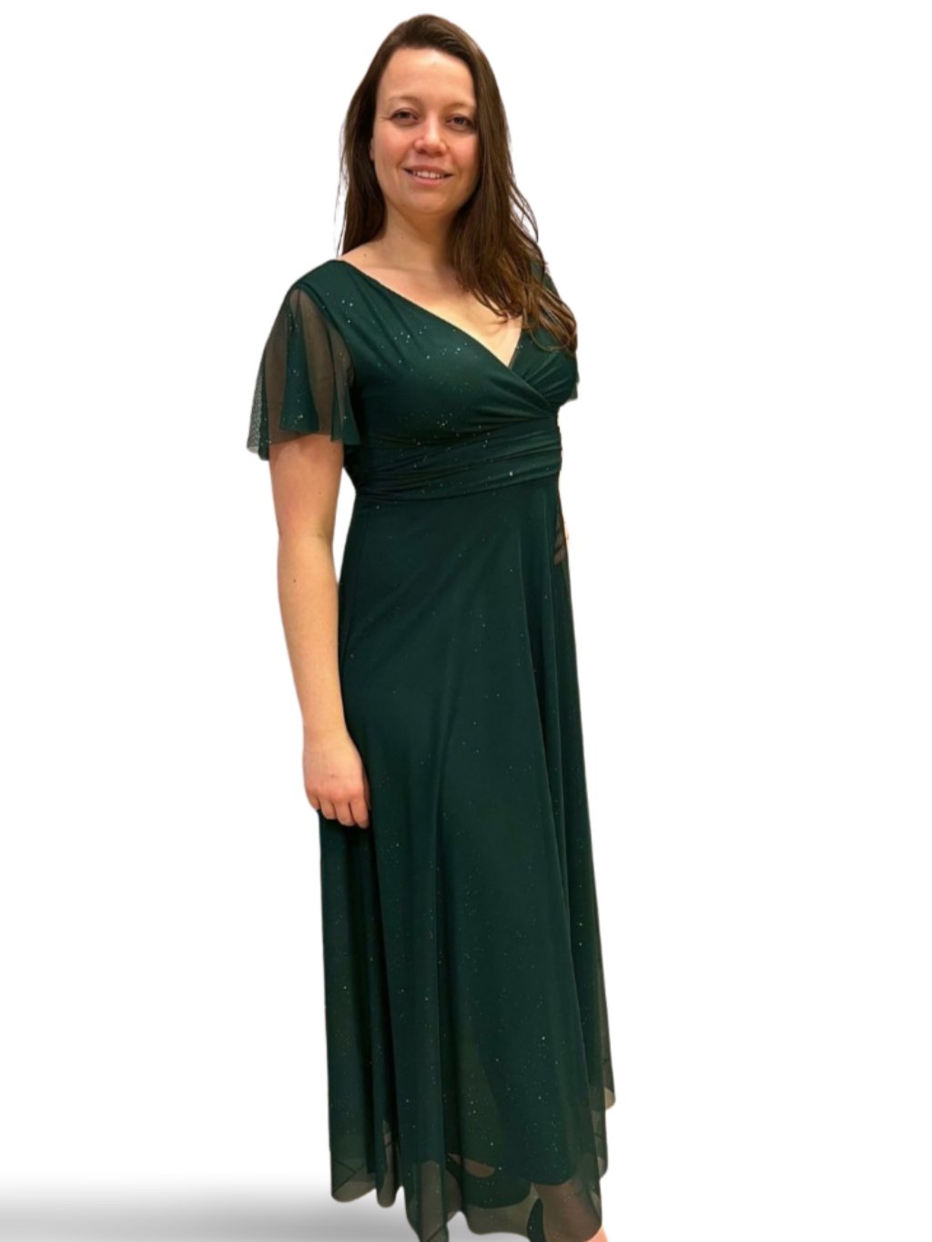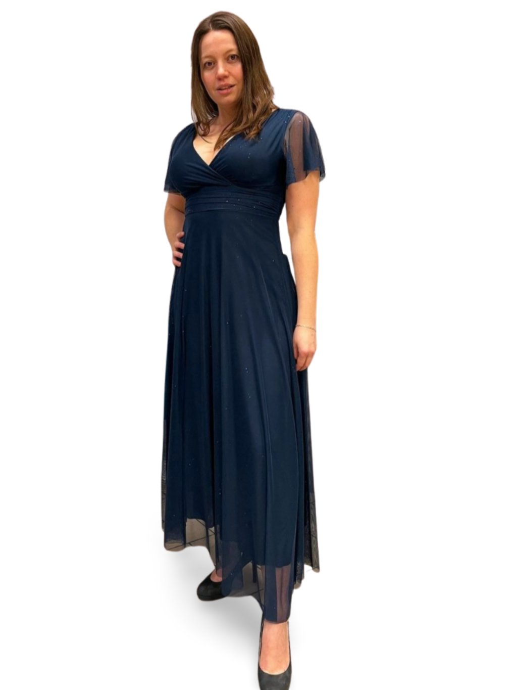 Dlouhé společenské šaty s tylovými rukávky. Šaty mají prsní vycpávky a vzadu zavazování na mašli.