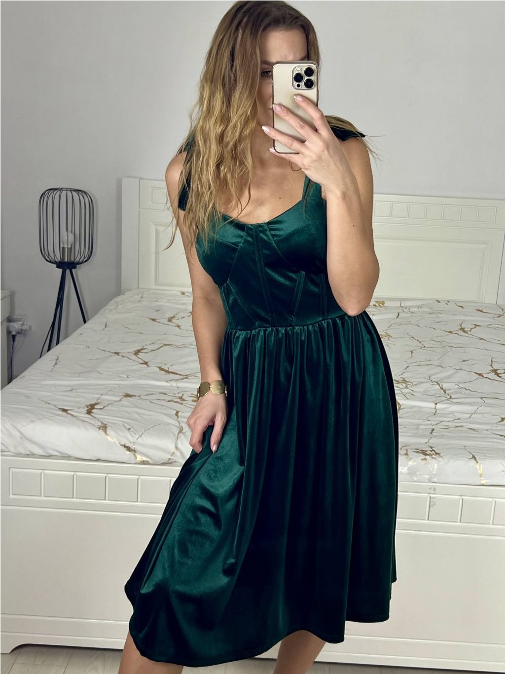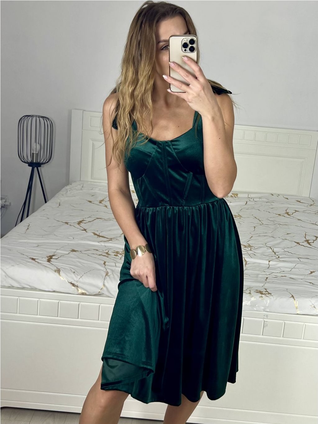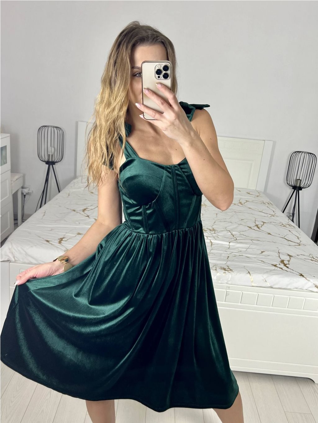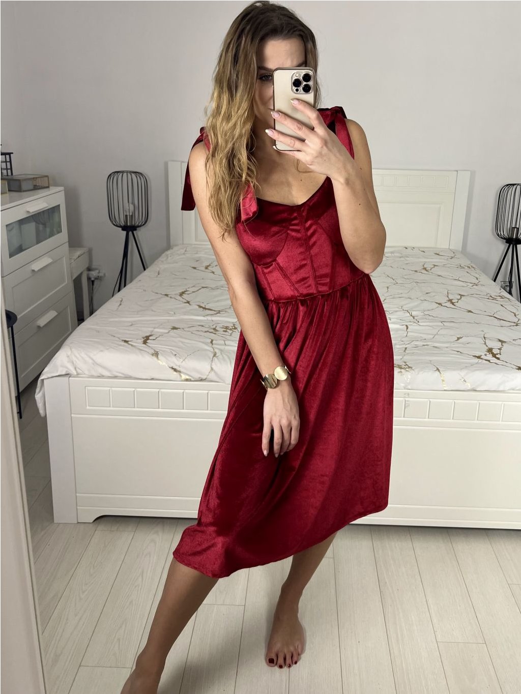 Sametové šaty na zavazovací široká ramínka. Šaty mají prsní vycpávky.