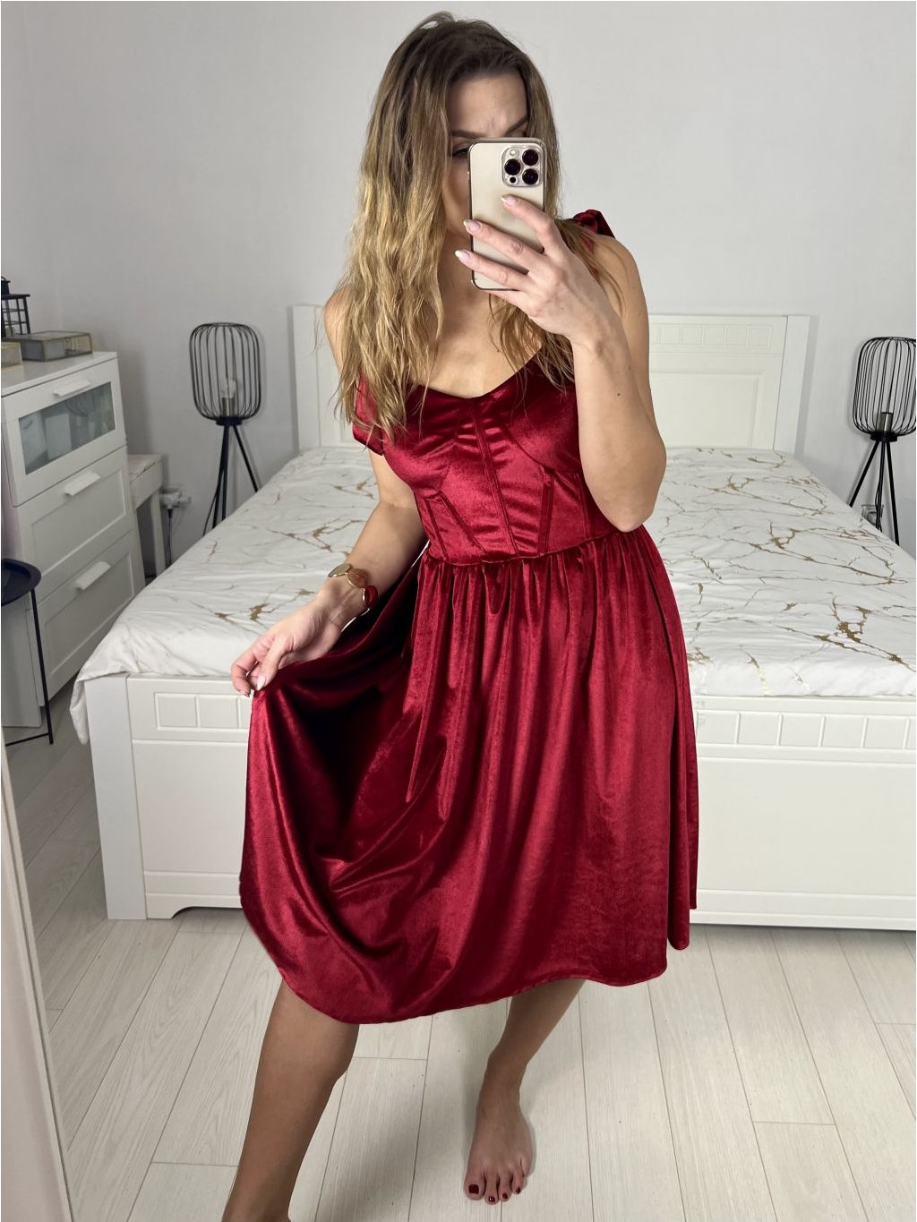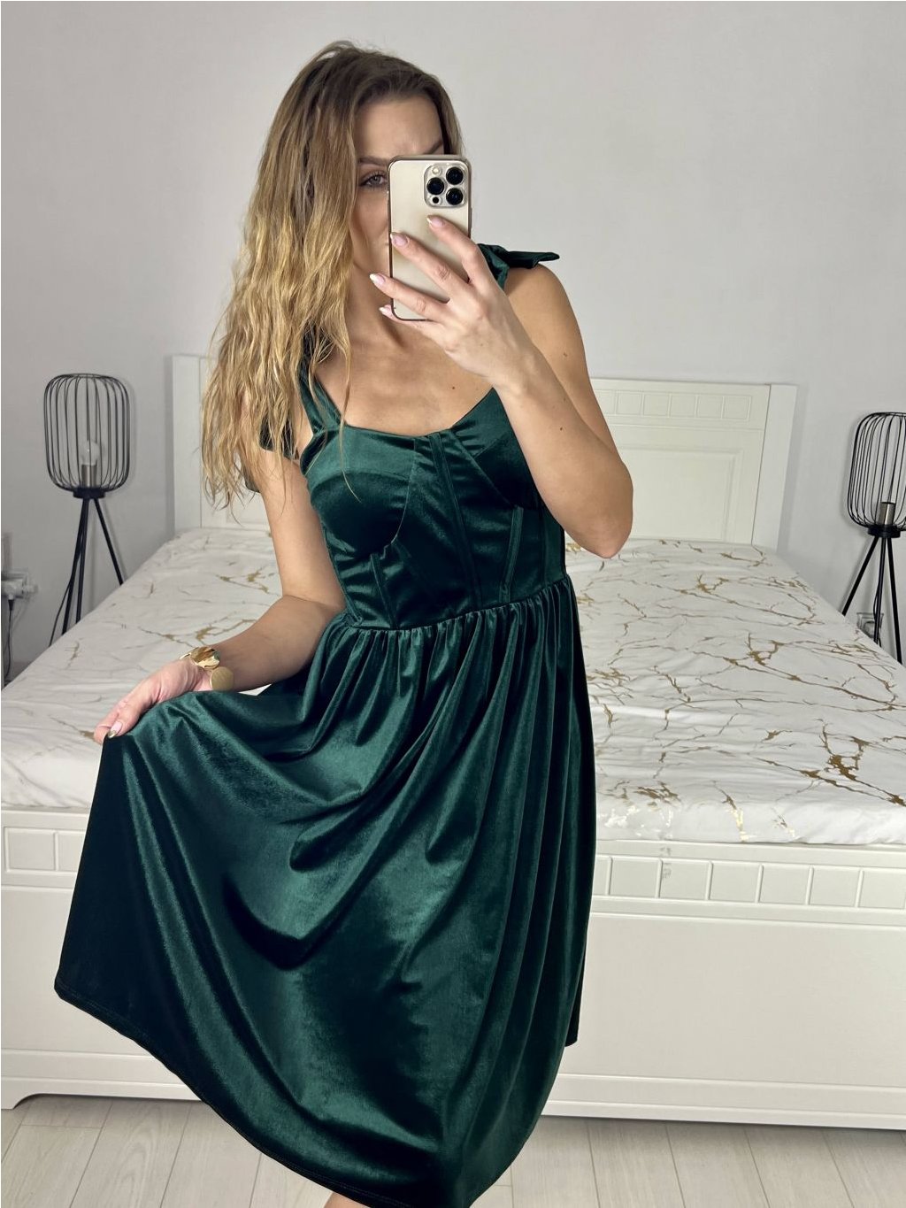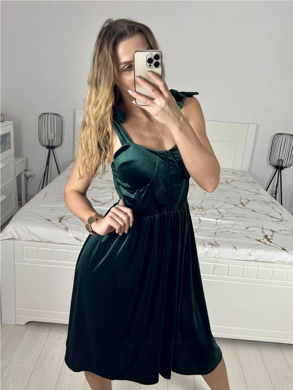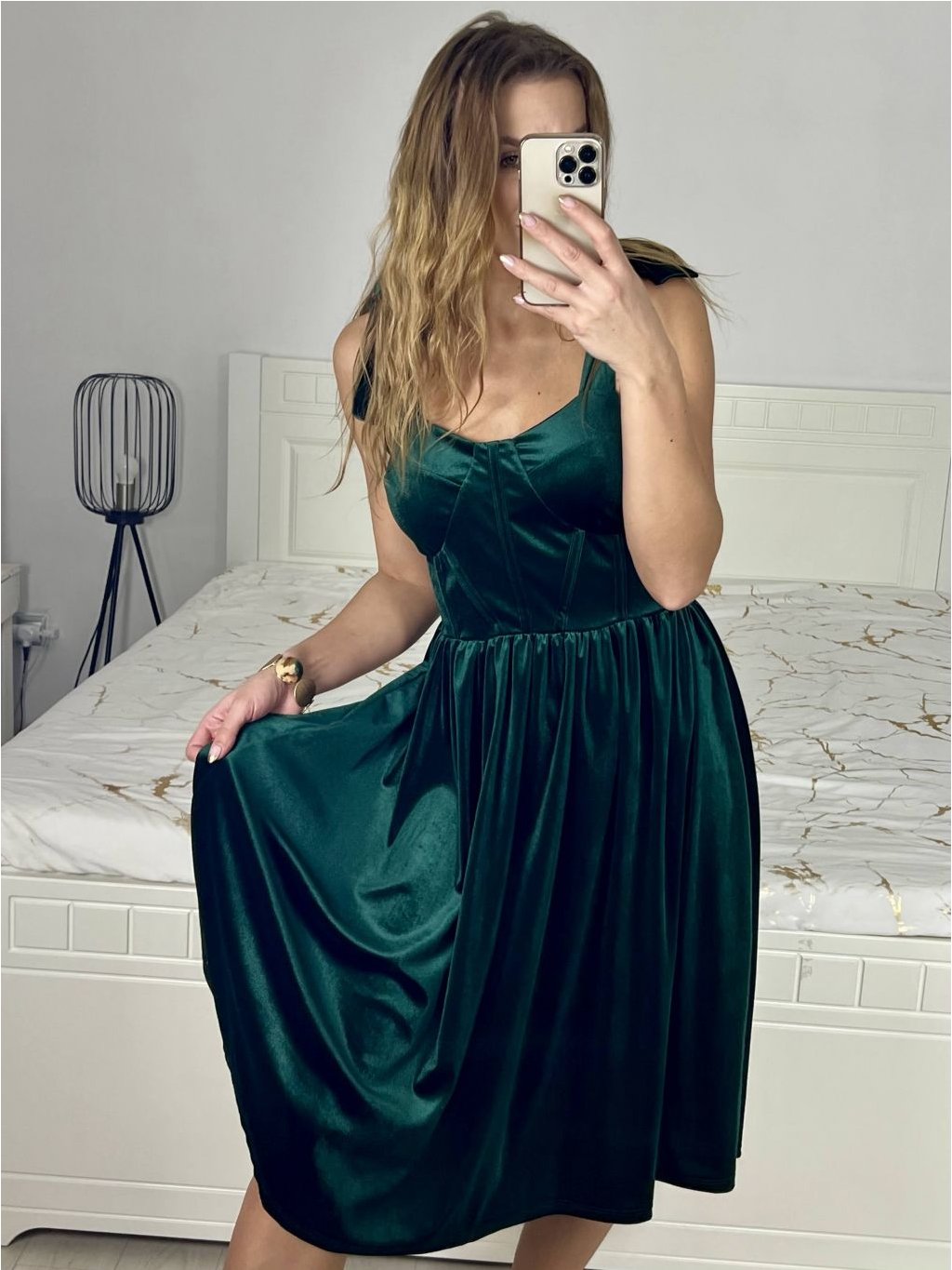 Sametové šaty na zavazovací široká ramínka. Šaty mají prsní vycpávky.
