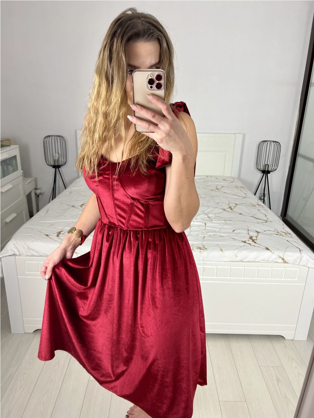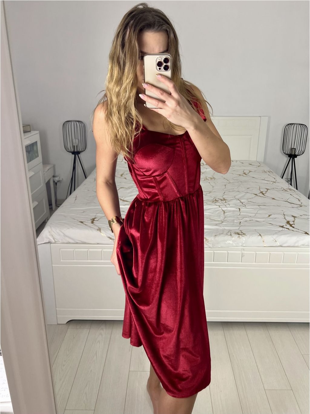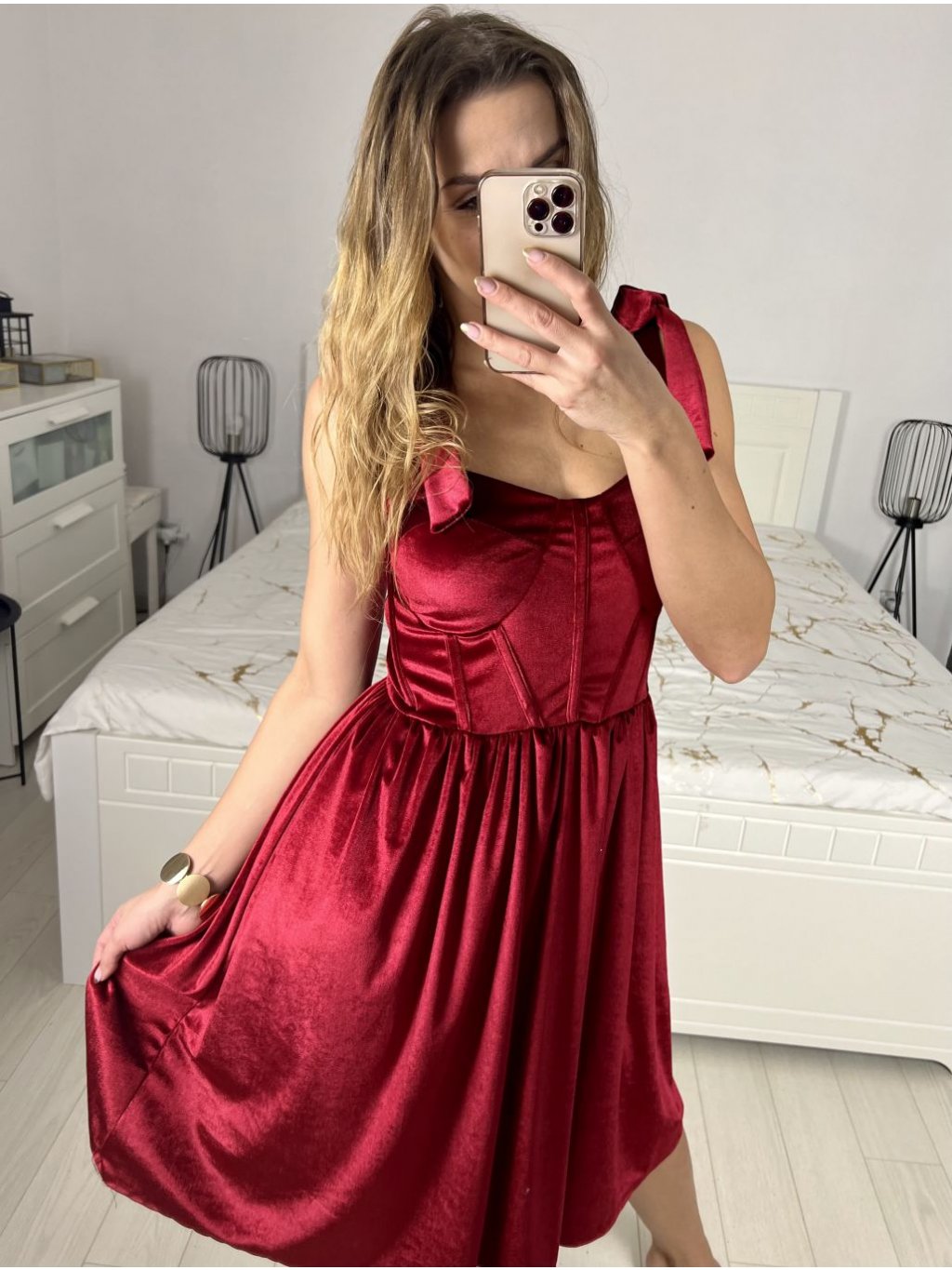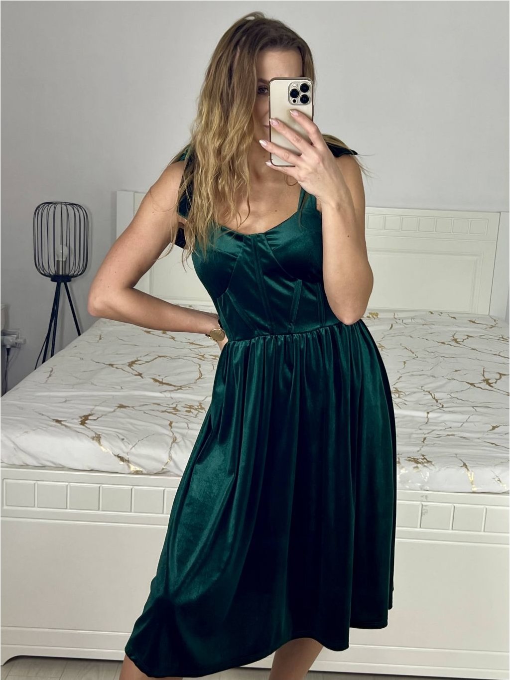Sametové šaty na zavazovací široká ramínka. Šaty mají prsní vycpávky.
