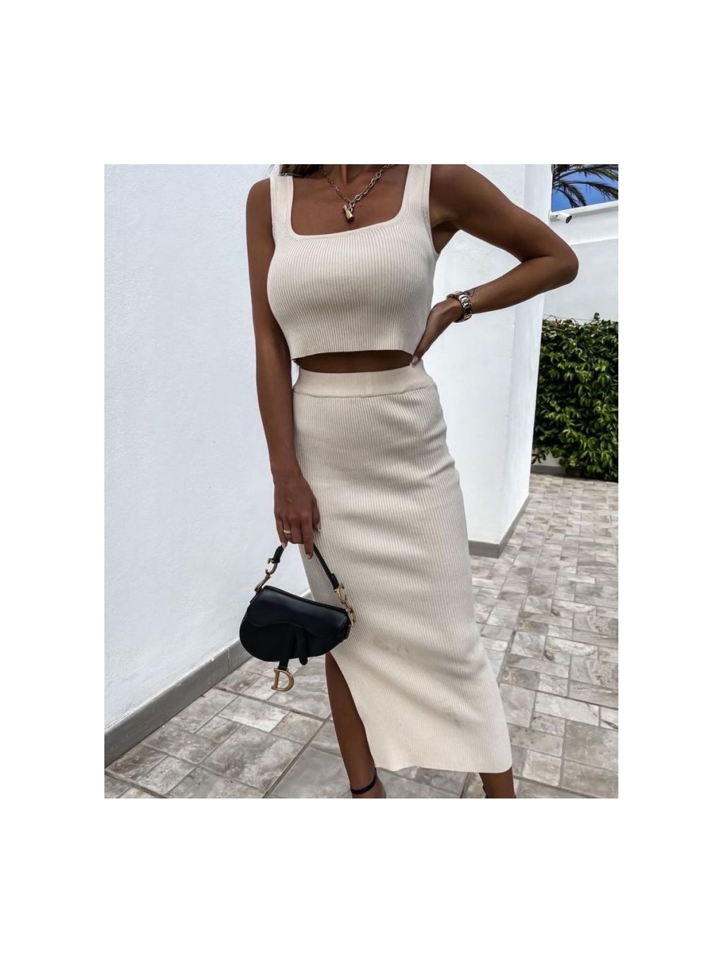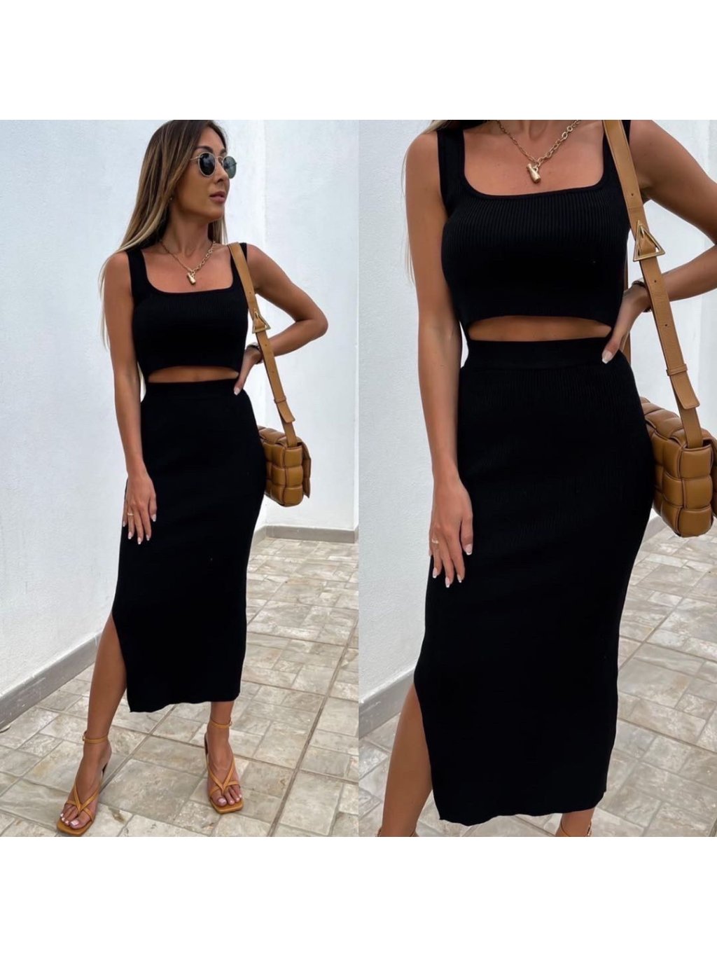 Žebrovaná souprava croptop na ramínka a sukně s rozparkem