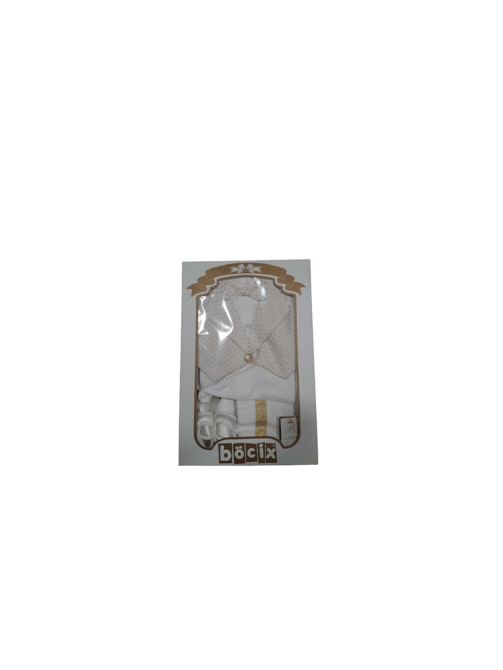 Komplet se skládá ze 4 věcí: triko, kalhoty, obuv, baret
