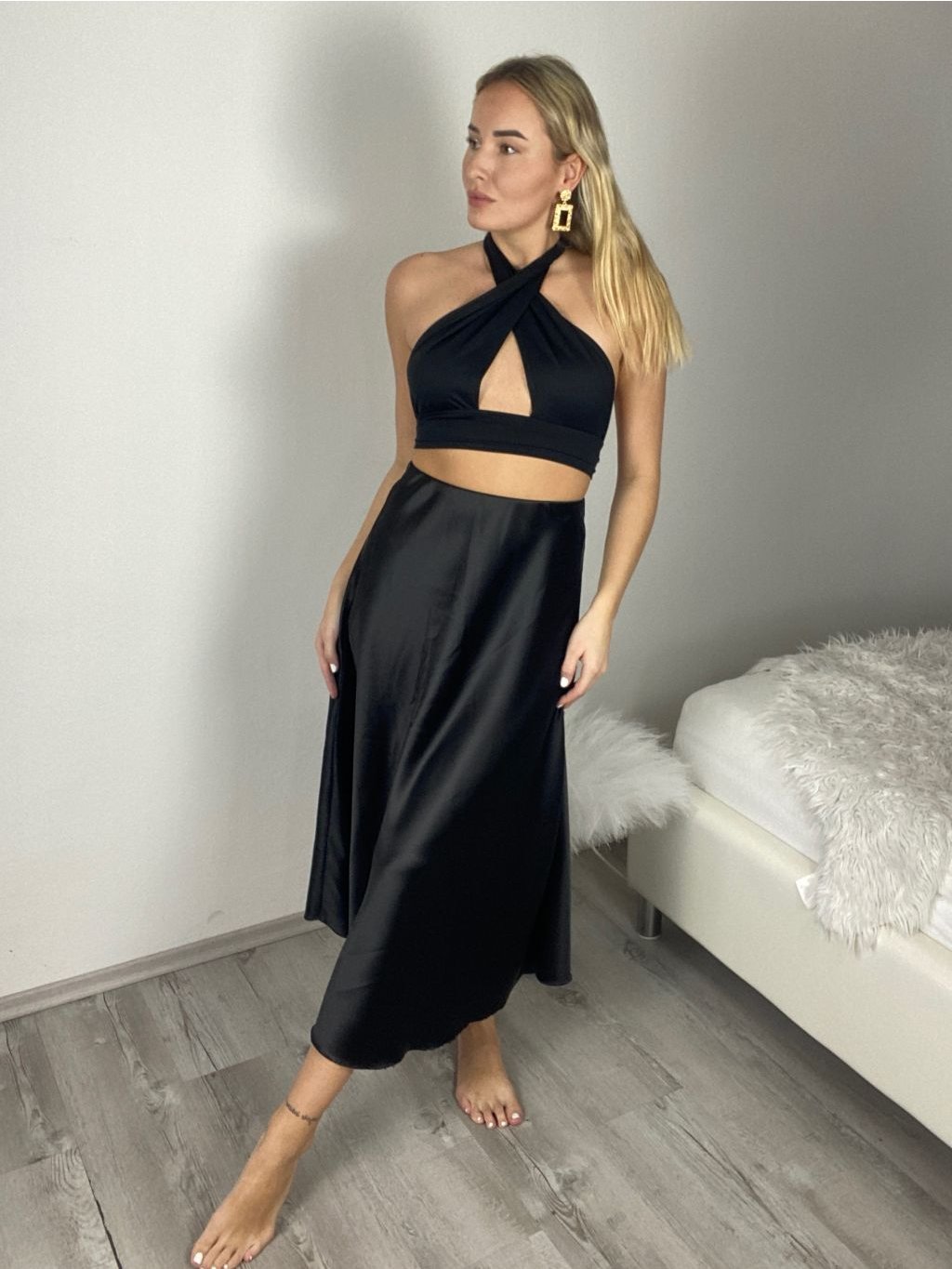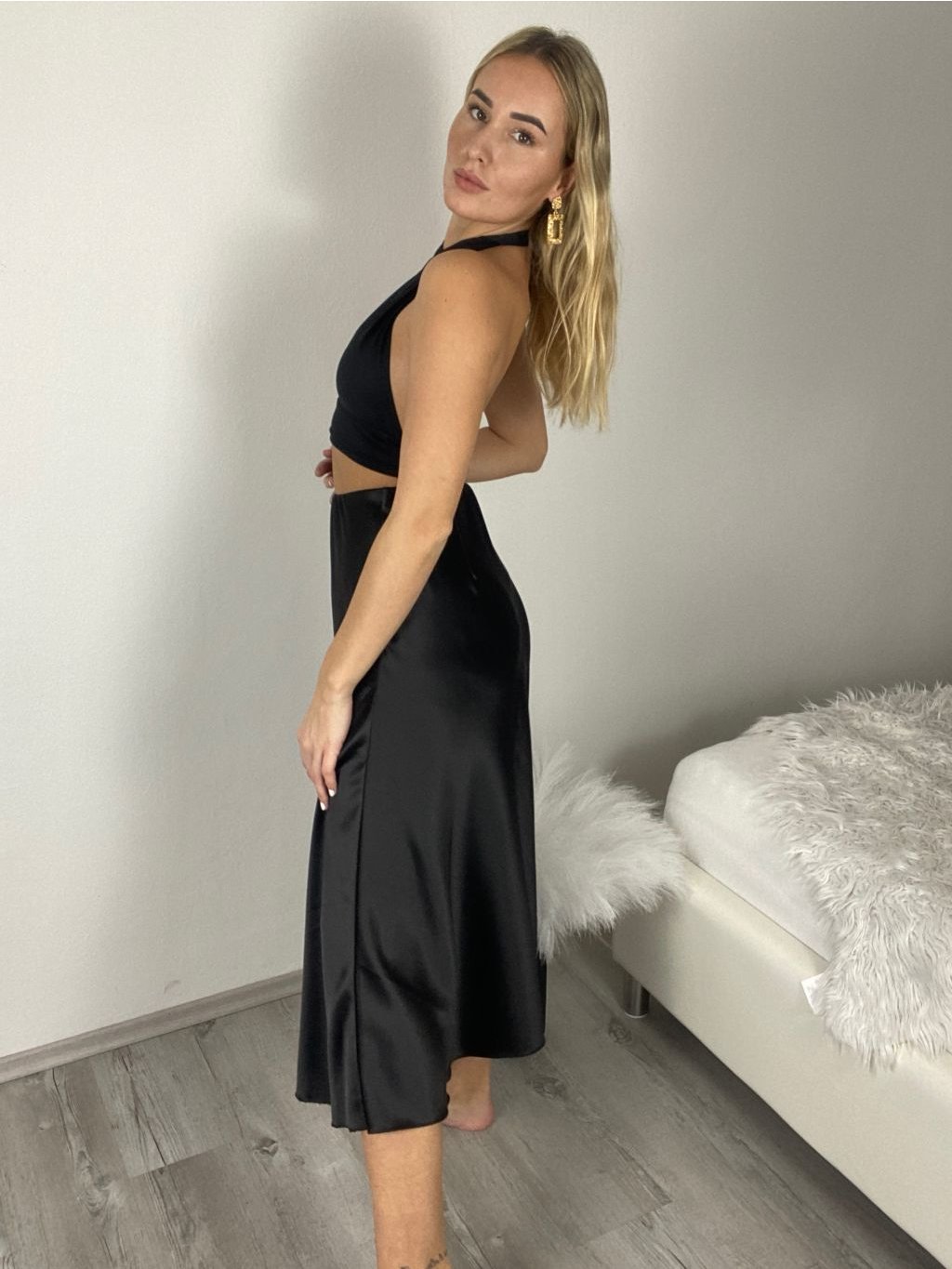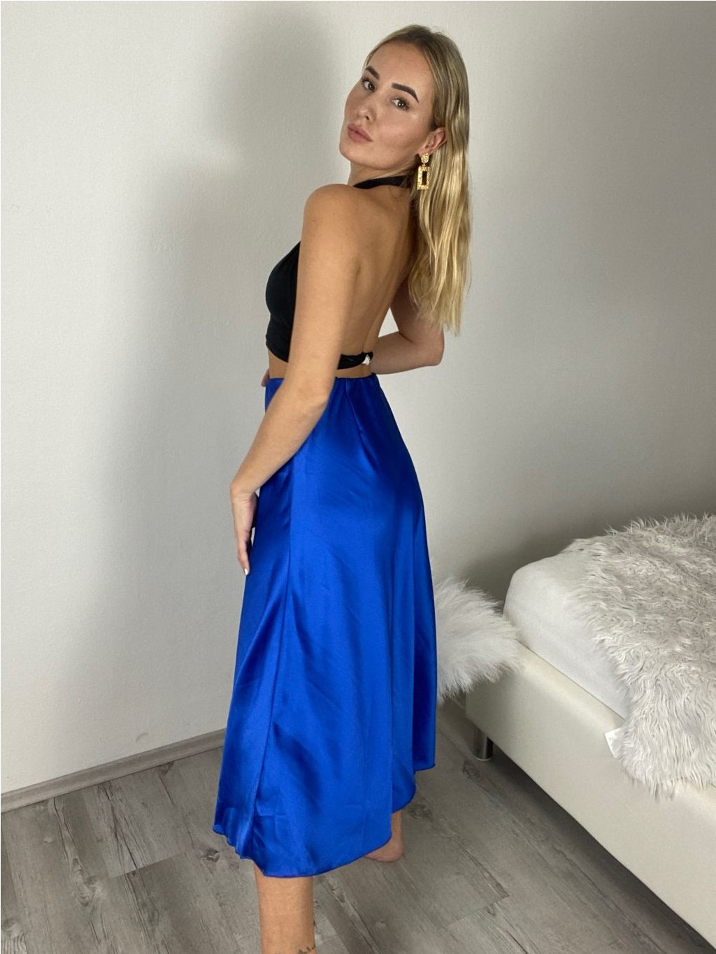Středně dlouhá saténová sukně, v pase na gumu.